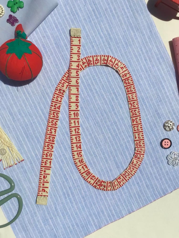· TAPE MEASURE NECKLACE WITH HANDWOVEN TAPE TIPS, MAKING IT LIGHTER TO WEAR.