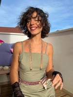 · TAPE MEASURE NECKLACE WITH HANDWOVEN TAPE TIPS, MAKING IT LIGHTER TO WEAR.