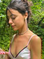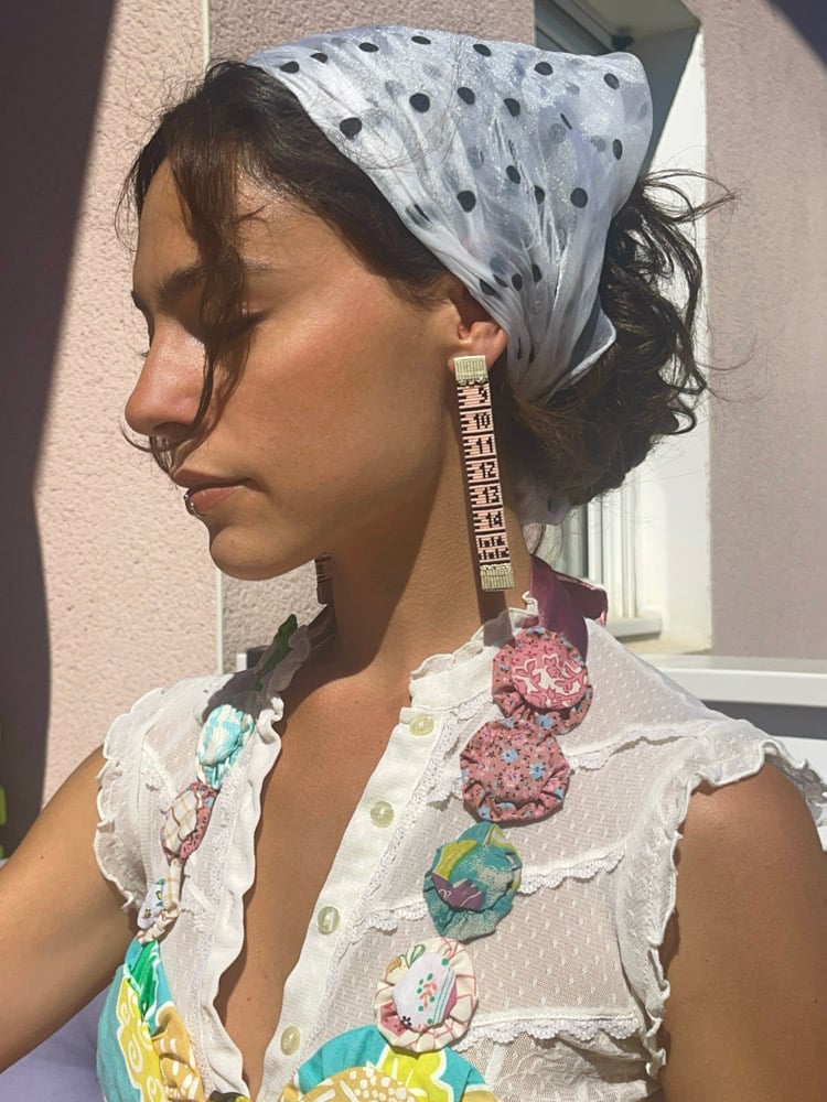 · TAPE MEASURE EARRINGS ~TURQUOISE & ALUMINIUM COLOR STOPPERS.
