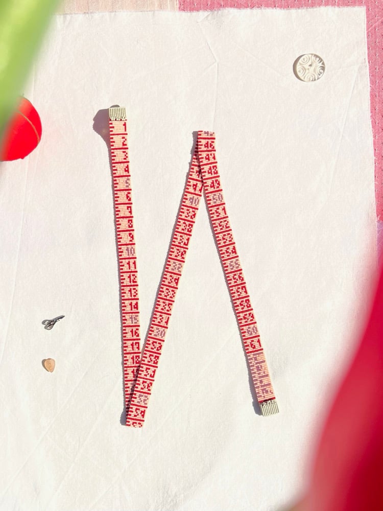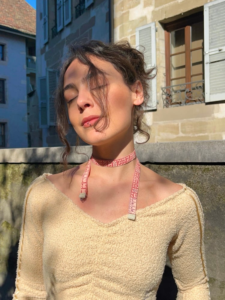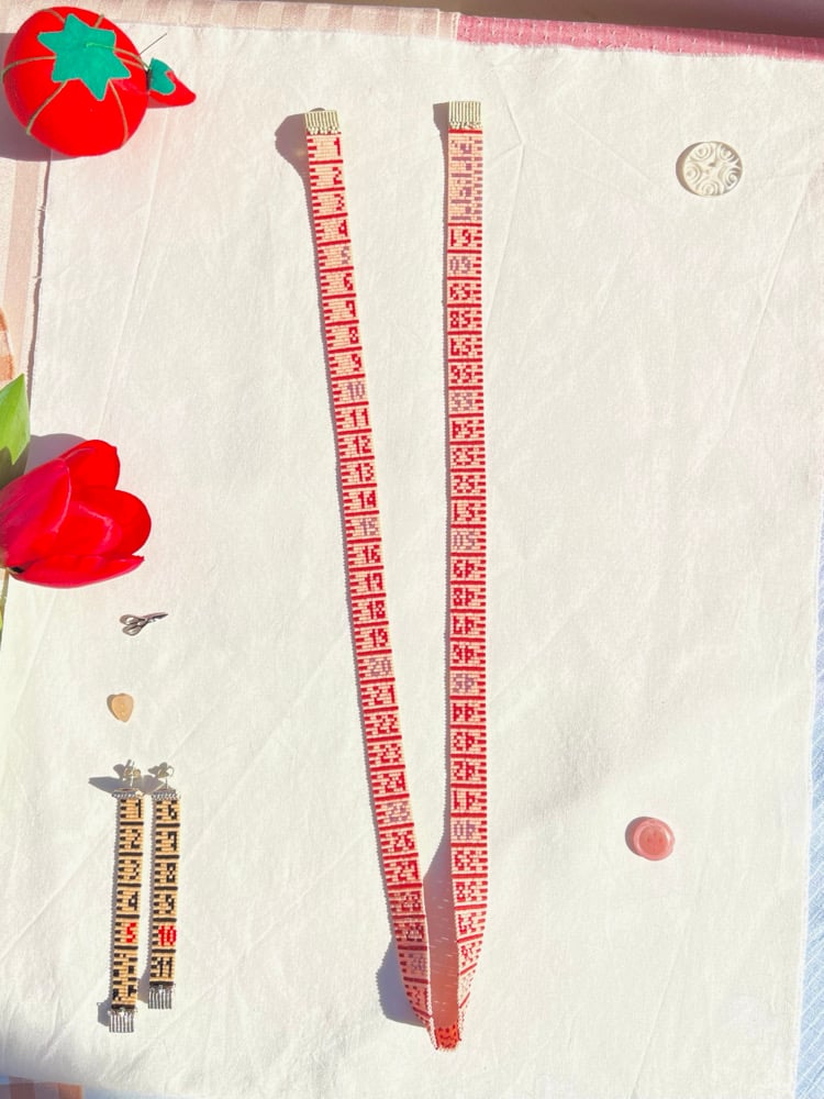 · TAPE MEASURE NECKLACE WITH HANDWOVEN TAPE TIPS, MAKING IT LIGHTER TO WEAR.