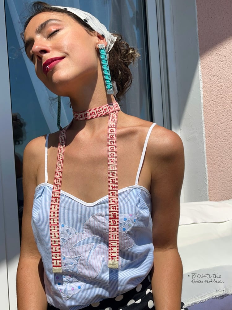 · EXTRA LARGE TAPE MEASURE NECKLACE WITH HANDWOVEN TAPE TIPS, MAKING IT LIGHTER TO WEAR.